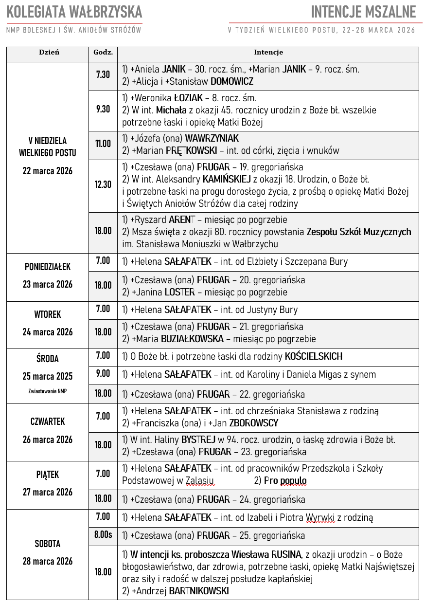 - 12:00: Msza św. odprawiana przez Księży kanoników Kapituły Wałbrzyskiej Kapituły Kolegiackiej
